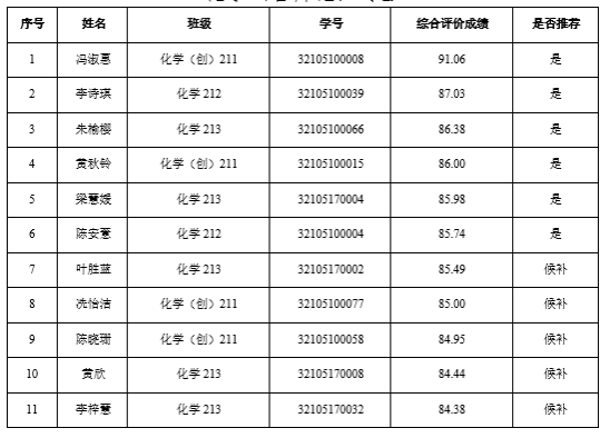 推免名额共10名,其中化学(含师范)专业6名,化学工程与工艺专业4名。现将推免生候选人的综合评价成绩及排名情况予以公示,公示结果如下: