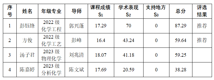 评审,拟推荐彭钰峰(2022级化学工程)、方俊(2022级化学工艺)两位同学为2025年色漫