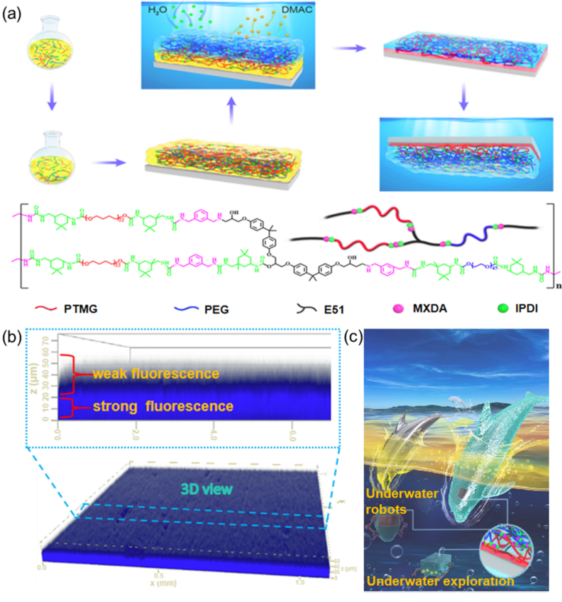 自然界中,鱼类、藻类等众多海洋生物进化出水凝胶类的生物表面,在水下环境中表现出优异的疏油、防污、减阻、抗生物粘附等功能。在合成材料的开发与应用过程中,水凝胶材料高度的亲水性结构和水化层界面,导致其在水下环境中难以实现与基材高强度长时间的附着性,限制了水凝胶作为涂层材料在船舶、平台和各类水下装备等领域的应用。近日,色漫