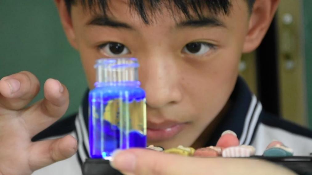 (图为趣味化学实验课上学生观察熔岩灯实验成品)