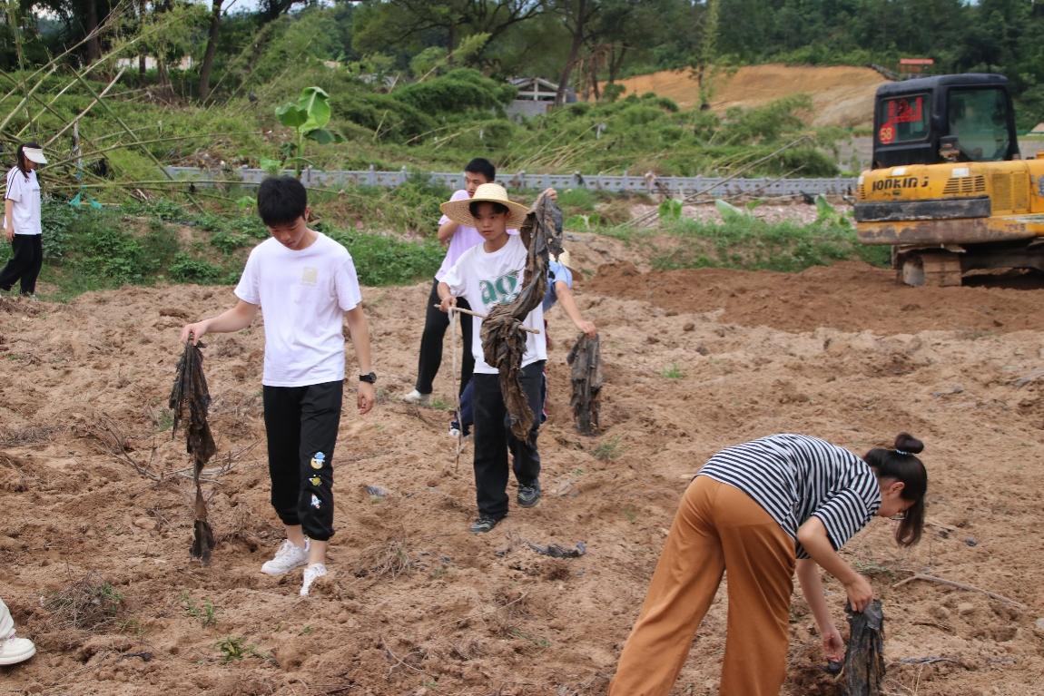 (图为突击队师生在农田清理洪水遗留塑料垃圾)