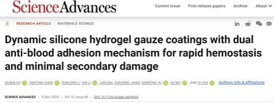 近日,吴旭教授、徐秀彬讲师在《Science Advances》上发表题为“Dynamic silicone hydrogel gauze coatings with dual anti-blood adhesion mechanism for rapid hemostasis and minimal secondary damage”的研究论文,论文报道了色漫