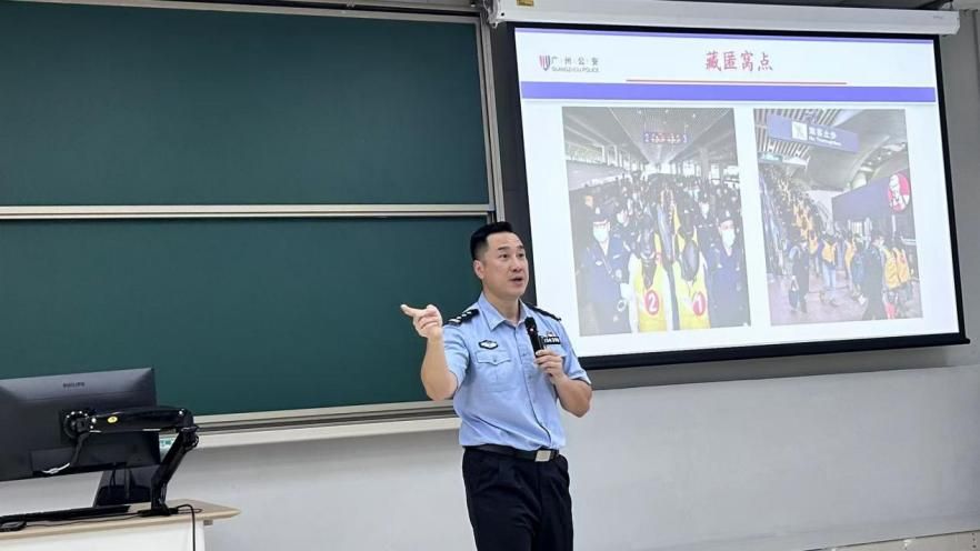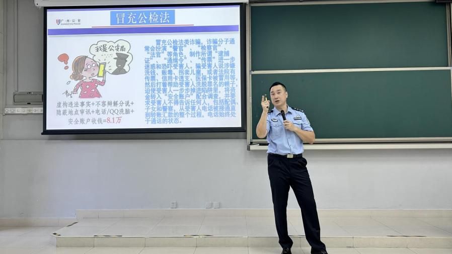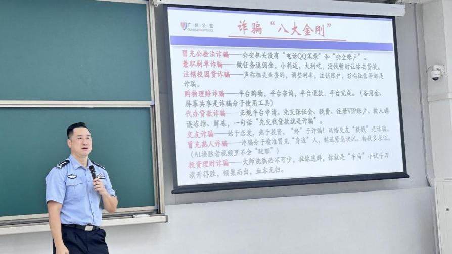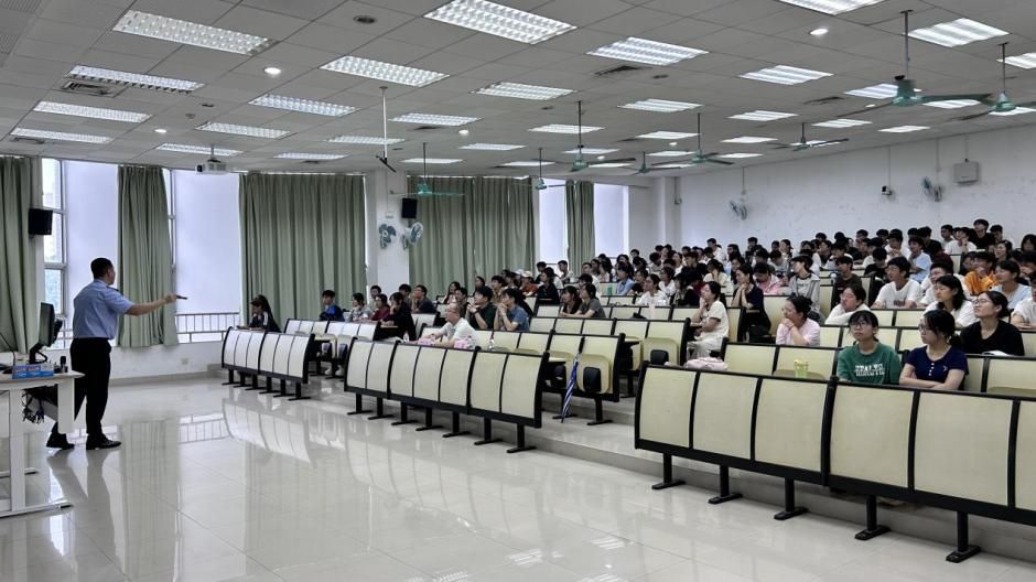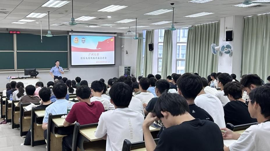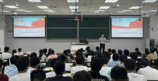 在理科南522教室举办了一场别开生面的反诈知识讲座。本次讲座特邀经验丰富的番禺反诈中心王鑫警官担任主讲,李红宾副书记、许同晖老师、朱景武老师和25级新生参加了此次讲座。