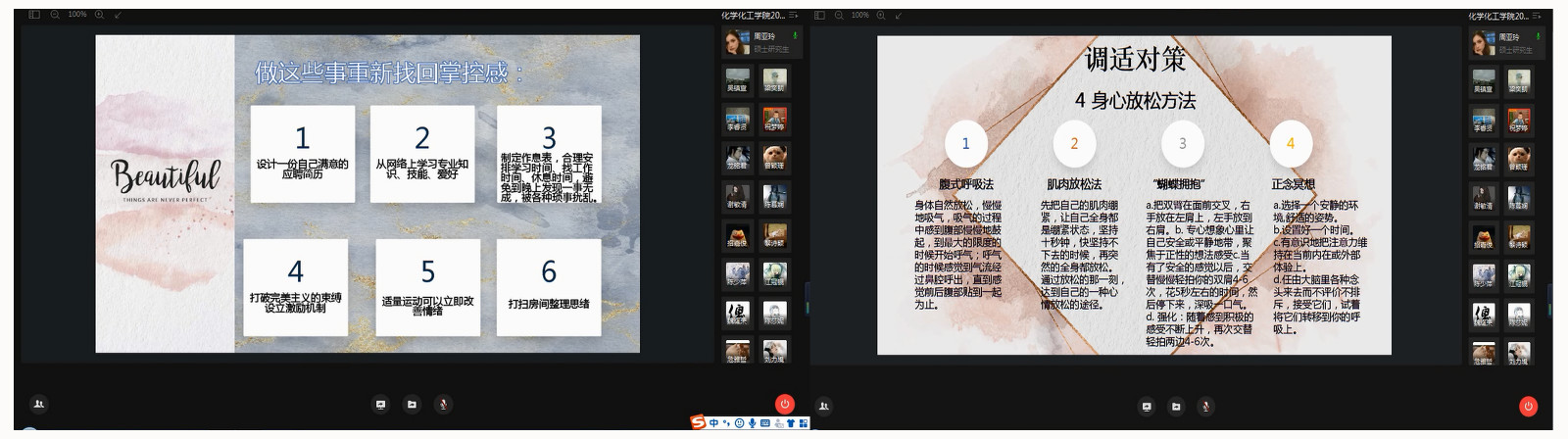 心理工作兼职辅导员周亚玲给毕业生同学开展了题为“疫情之下,应届毕业生的心理困惑与调适”专题讲座,从毕业生的心理困惑和调试对策两方面来帮助毕业生疏导毕业焦虑情绪,她指出今年毕业生可能会面临各类压力和焦虑,并给出了包括学会接纳焦虑、“脑内法庭”技术、建立积极心态和身心放松等调适建议来疏导同学们的毕业和就业压力。
