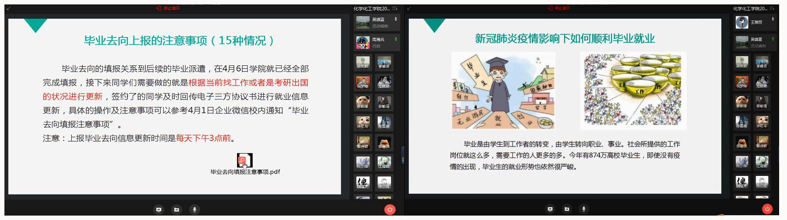 会根据具体情况调整开学、答辩和毕业等相关事项的时间点和要求。她希望毕业生能充分认识到受国内外新冠肺炎疫情和经济运行形势等叠加影响下严峻的就业环境,在求职过程中明确自身定位,调整就业期望值,切忌好高骛远。同时提醒毕业生要充分利用学校就业信息平台、网络资源等多渠道多平台获得就业信息、投放简历,做好求职准备,提升应聘效果。李睿贤副书记向全体毕业生提出了三点要求:一是要严格遵守国家和学校疫情防控的有关要求,做好个人健康防控,积极配合学校为开学复课做好准备工作;二是充分认清当前就业形势的严峻性,增强就业的紧迫感,做好求职简历,打造求职名片;三要按时完成学业任务,认真做好毕业论文或毕业设计,确保顺利毕业。