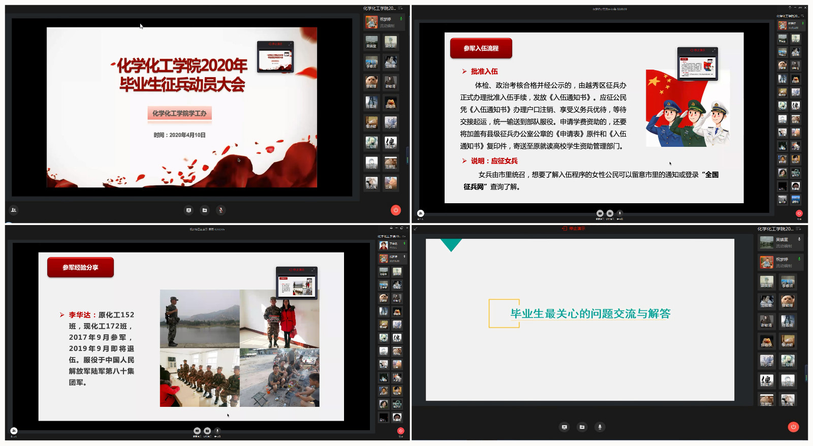 最后,辅导员祝梦婷老师进行2020届毕业生参军入伍动员,给毕业生介绍了参军入伍的优惠政策、基本条件和具体流程,为同学们的毕业提供了更多的选择方向。同时邀请了退伍复学的李华达同学向大家分享他的军旅生活和参军入伍后的收获与成长,以亲身经历的军营故事给有意向参军入伍的毕业生们提供了参考。
