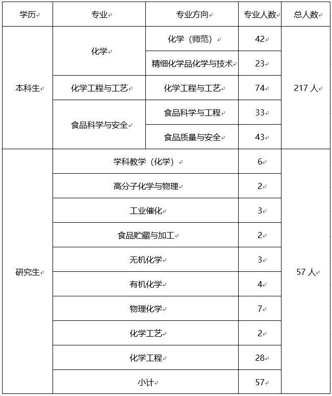 有毕业生274人,其中本科毕业生217人,其中化学专业65人、化学工程与工艺专业74人、食品科学与安全76人;毕业研究生57人,专业方向有学科教学(化学)、高分子化学与物理、工业催化、食品贮藏与加工、无机化学、有机化学、物理化学、化学工程、化学工艺等。
