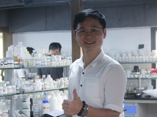 李茂锐师兄的公司位于白云区东粤生态园内,别致的装修让人耳目一新,风格简约清新,不失大气。透明玻璃后的化学实验室麻雀虽小五脏俱全,各种化学用品琳琅满目,空气中弥漫着化妆品香料的气味,彰显化院学子的风采。