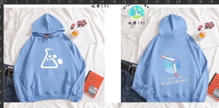 班服正面有喷绘的装着实验液体的锥形瓶,小巧可爱却不失大方端庄,象征着同学们热爱学习、钟爱实验的崇高精神! 班服反面下侧是英文“CLASS 191,WE ARE THE BEST”,其中文意思是“191班,我们是最棒的”。字母全部使用大写,意在突出同学们高昂的斗志和飒爽的英姿!中间是两只试管正在进行实验操作,体现了同学们在实验室的日常生活状况,象征着同学们严谨治学的精神!试管背后有三个动漫人物坐在一起讨论,代表着着同学们课前课后认真讨论知识点,寓意大家刻苦钻研、共同进步!图案的右上方有弧形的英文字母“CHEM IS TRY”,代表着化学是一门以实验为基础的学科,同学们也都在学习、科研上勇于尝试、不忘初心!