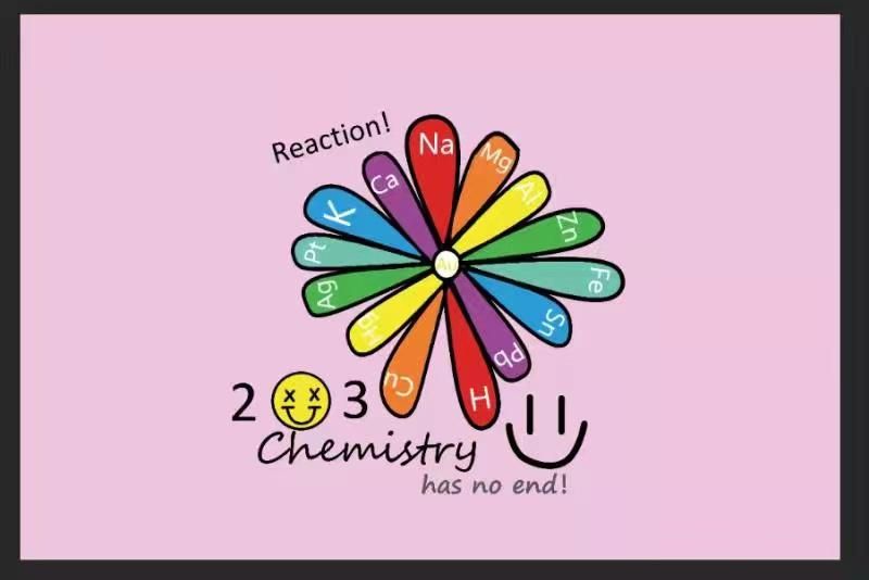 班服的设计是以手写英文单词“chemistry”代表化学专业;以“笑脸”象征乐观;以代表卤素的字母“X”为眼睛部分;以代表碘元素的字母“I”经过艺术加工后作为“笑脸”的嘴巴部分。“笑脸”嵌在“203”的数字“0”上,代表班级的共同精神内核是乐观。班服前面的徽章和班旗的图案相同,是以各种元素为花瓣组成七彩的花朵。花朵下方有英文单词“chemistry”和数字“203”,象征每个有着独一无二的个性但有着共同理想信念的个体共同组成化学203这个大集体。
