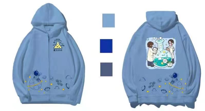 本班服以蓝色为基调,代表了化学213班属于化院。班服背面中间有小人做化学实验的图案,突出化学工程与工艺专业以及同学积极探索实践的精神。底下的太空小人寓意着我们的目标是星辰大海的豪情壮志。