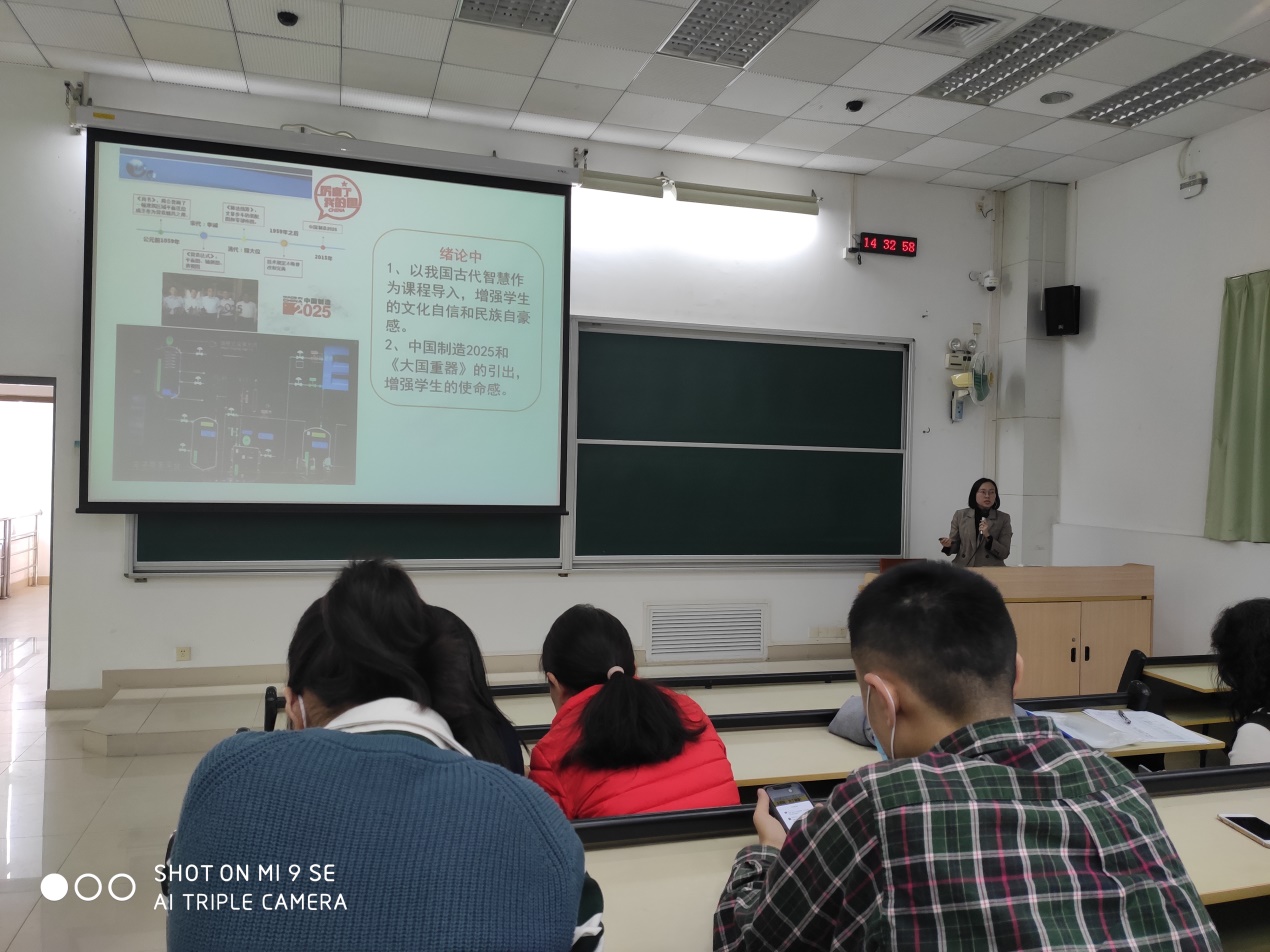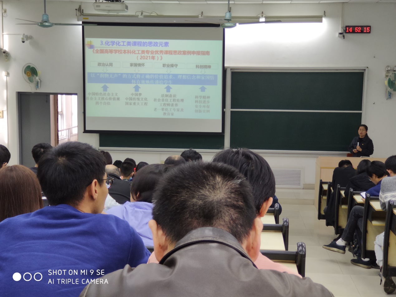 林龑勇老师分享了无机化学课程中引入学科前沿、学科技术瓶颈等案例,并在课程思政的实施方法、考核设计以及评价反馈等方面所做的尝试。毛桃嫣老师结合专业概论和化工制图两门课程,从课程的知识目标、能力目标和价值观目标三个方面,详细介绍了课程思政的建设思路、实施路径等做法。邹汉波副院长介绍了化学化工类课程的思政点,并结合化学反应工程课程中“凝集流模型”这一教学内容,通过引入大国重器——PTA氧化反应器、超级浆态床加氢反应器、气流床气化技术等,提升学生对专业领域的了解,培养学生精益求精的工匠精神,激发学生的家国情怀和使命担当。最后指出了每位老师在思政课堂、思政课程、思政优秀案例、思政教学竞赛等方面可以参与的工作。